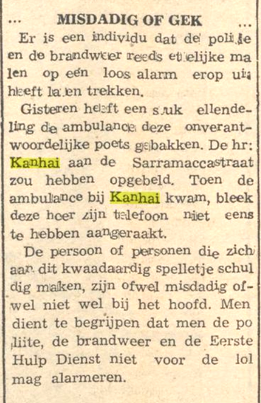 Krantenknipsel waaruit blijkt dat hij mensen in die tijd ook niet terugdeinsden voor een grapje