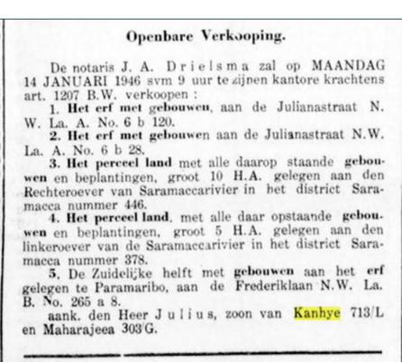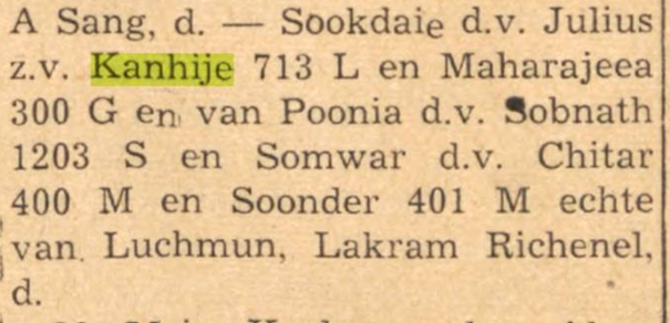 • Soerji Kanhai (V) • Ramradj Kanhai (M) • Soekdei Kanhai (V) • Eduard Sewlochan Kanhai (M) • Christina Rampiari Kanhai (V) • Julius Hardew Kanhai (M) • Gangapersad/Thomas Kanhai (M) • Jules/Jamnapersad Kanhai (M) |